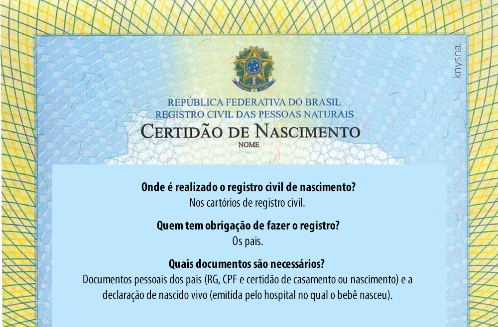 Os pais, ou somente um deles (como já citado antes), devem levar seus documentos pessoais (RG, CPF e certidão de casamento ou nascimento) e a Declaração de Nascido Vivo (emitida pelo hospital no qual o bebê nasceu).